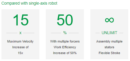 고속, 고정밀의 작업이 필요한 응용분야에 적합한 제품으로 Core-Type 과 Non-core-Type으로 구성되어 있습니다. Non-core-Type의 경우에는 더 가벼우며, 동적 특성이 우수하며 모터와 부하 사이에는 구동 메커니즘이 없습니다. 직접 구동 메커니즘은 더 간단하여 탁월한 동적 응답을 가지고 있습니다. 또한 리니어모터는 비접촉용으로 설계되어 마모를 일으키지 않으며 정확도와 수명이 우수합니다.